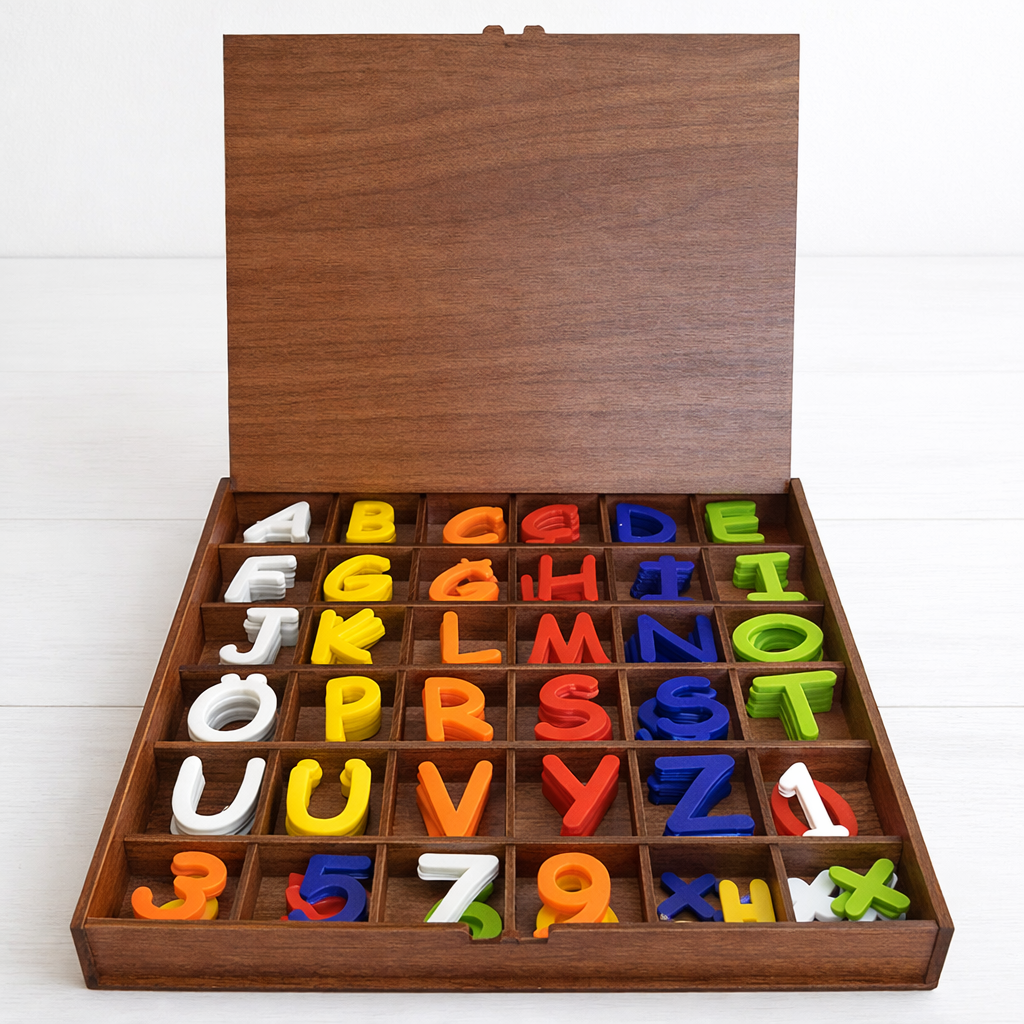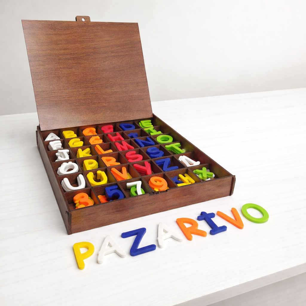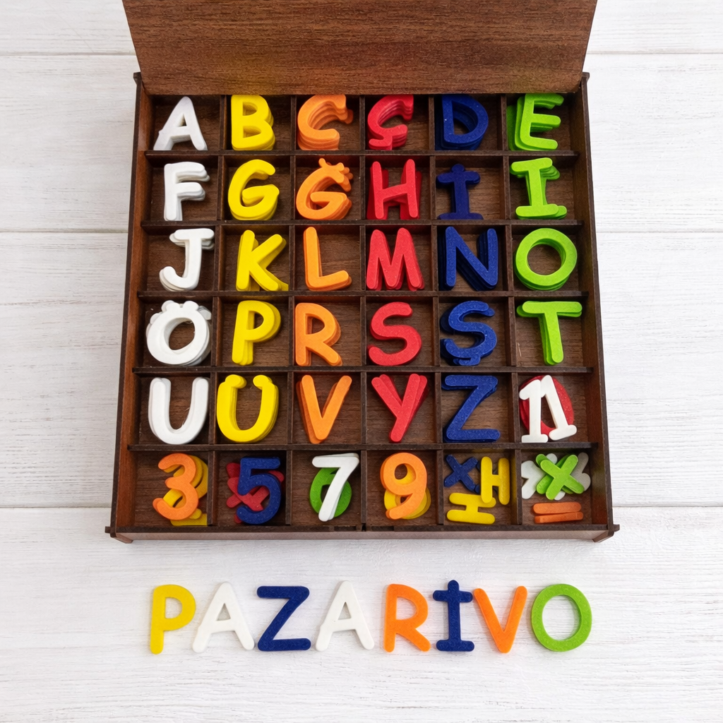 Ahşap Kutulu Alfabe Seti, çocukların harfleri, rakamları ve temel matematik işlemlerini eğlenerek öğrenmesi için özel olarak tasarlanmış eğitici bir settir.