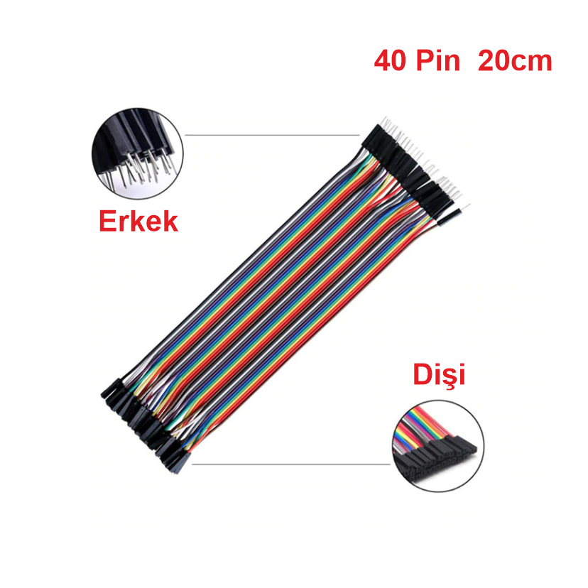 Kabloyu $20 ext{ cm}$ uzunluk, $40 ext{ Pin}$ adet ve kolay ayrılabilir şerit yapısıyla gönderiyoruz. Farklı renkler sayesinde VCC, GND ve Sinyal pinlerinizi kolayca takip edebilir, devre hatalarını en aza indirebilirsiniz.