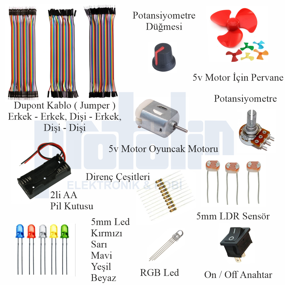 Toplam 38 farklı çeşitte 137 adet parça içeren bu kutu ile; trafik lambası yapımı, butonla motor kontrolü, ışık sensörü uygulamaları ve tabii ki kendi vantilatör projenizi hayata geçirebilirsiniz.