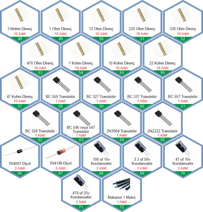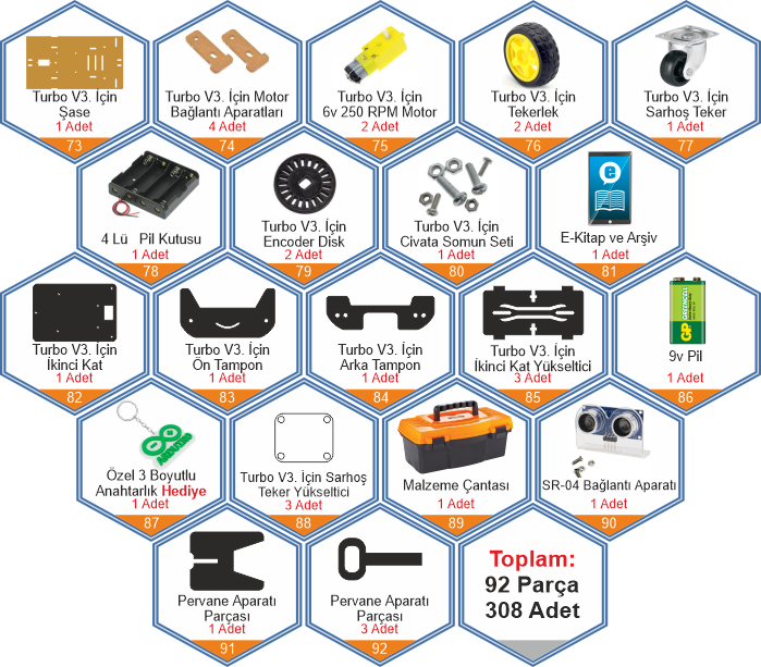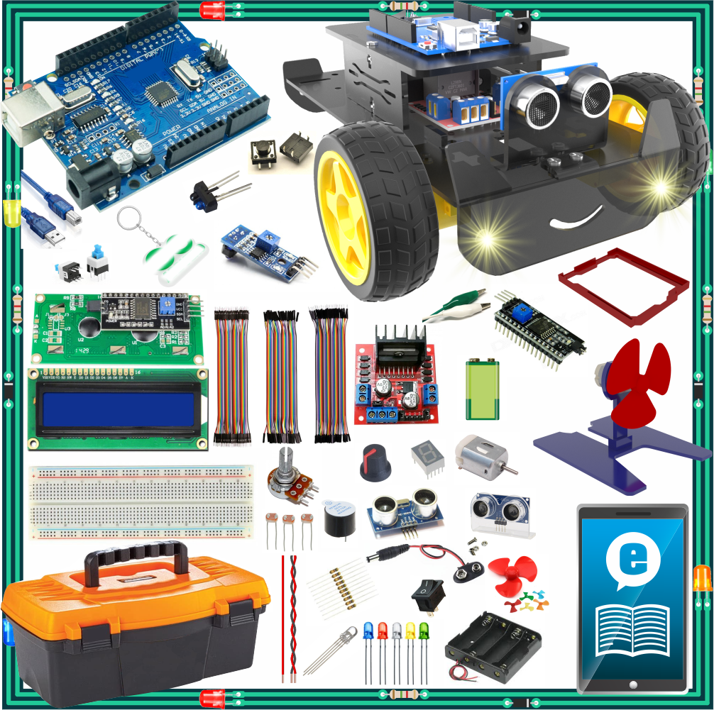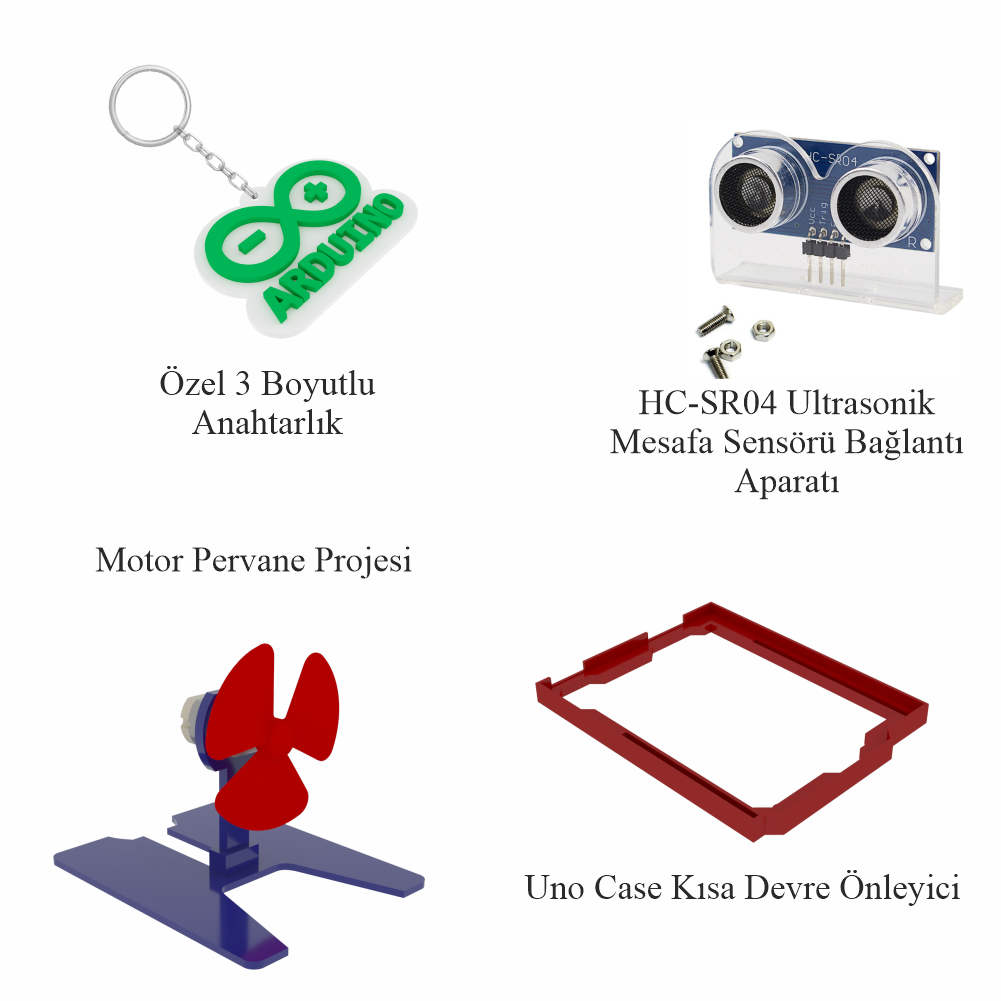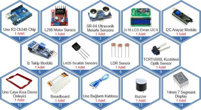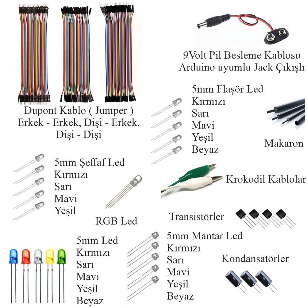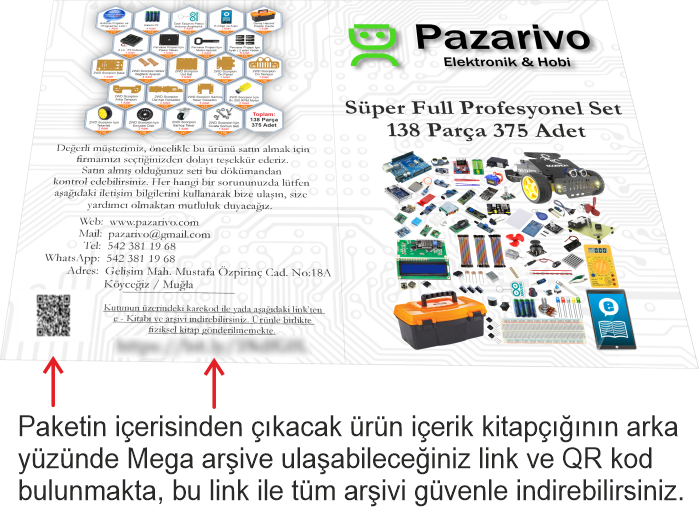 Bu set ile hem temel Arduino projelerini (Akıllı ev sistemleri, hırsız alarmı, mesafe ölçer vb.) yapabilir hem de Çizgi İzleyen Robot, Engelden Kaçan Robot gibi hareketli projeleri hayata geçirebilirsiniz. Malzeme arama derdine son veren, 92 çeşit bileşenden oluşan dev bir atölyedir.