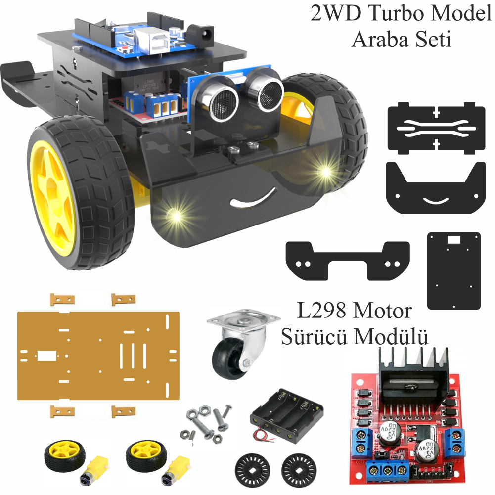 Robot Araba Dahil: Setin içinde tekerlekler, DC motorlar ve araç şasisi bulunur. Ekstra bir robot kiti almanıza gerek kalmaz.