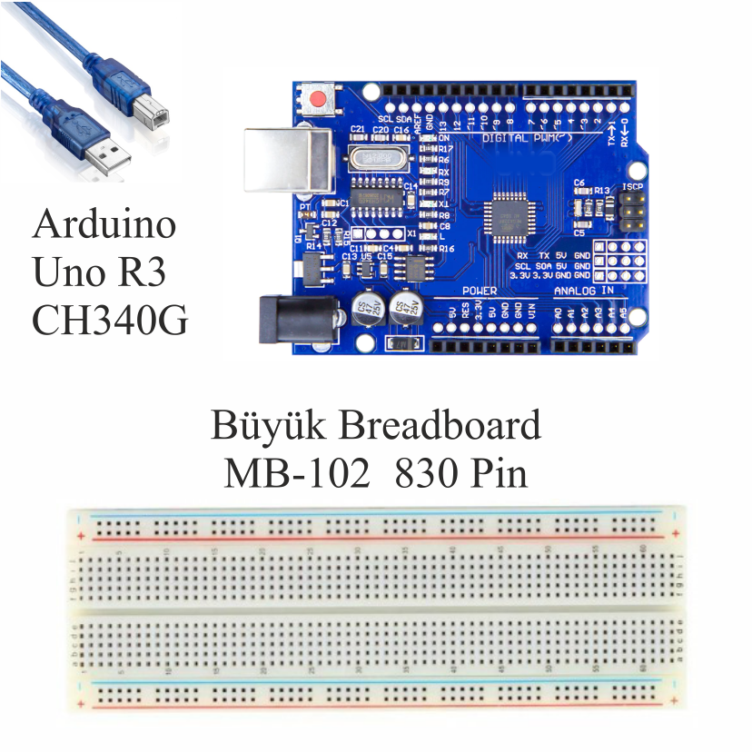 Uno R3 Gücü: Tüm projelerin beyni olan Arduino Uno R3 (Klon/CH340), setin merkezinde yer alır.