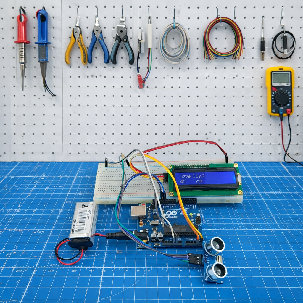 Gösterim: Sonuç, 16x2 LCD ekranda "Mesafe: X cm" şeklinde gösterilir.
