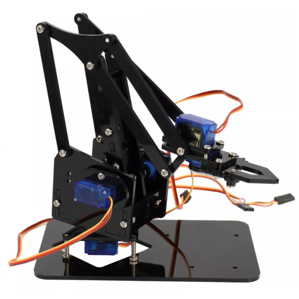 Bu set, Arduino veya farklı mikrodenetleyicilerle kontrol edebileceğiniz 4 Eksenli bir robot kol yapmanız için gerekli tüm ahşap/pleksi gövde parçalarını içerir. Montajı tamamlandığında, bir nesneyi bir yerden alıp başka bir yere taşıyabilecek (Pick and Place) yeteneğe sahip olur.