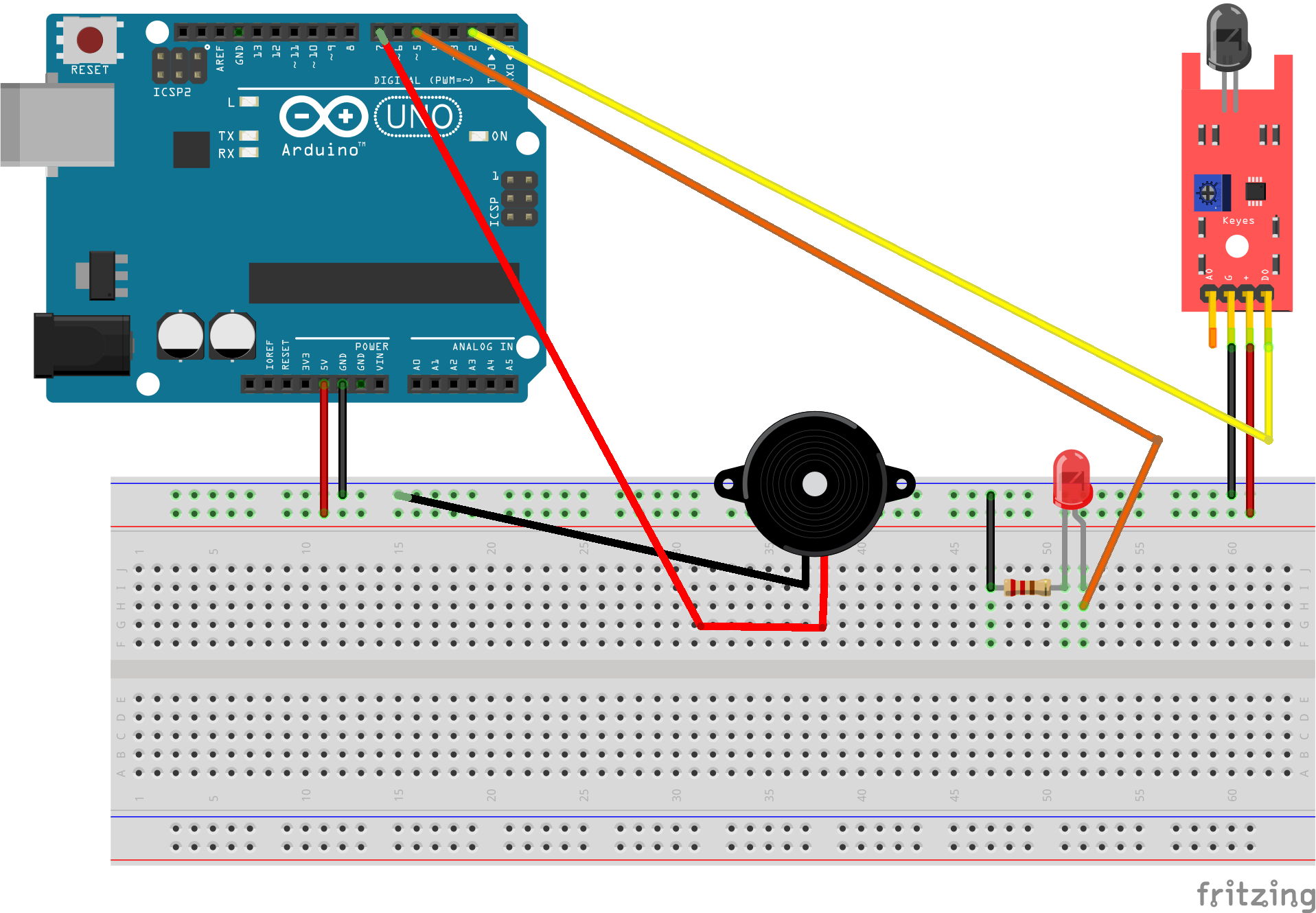 Tam Kurulu Sistem: Sensör, direnç ve buzzer bağlantıları breadboard üzerinde hazırdır.