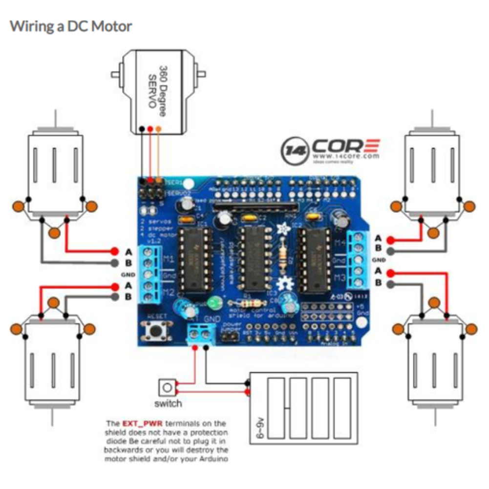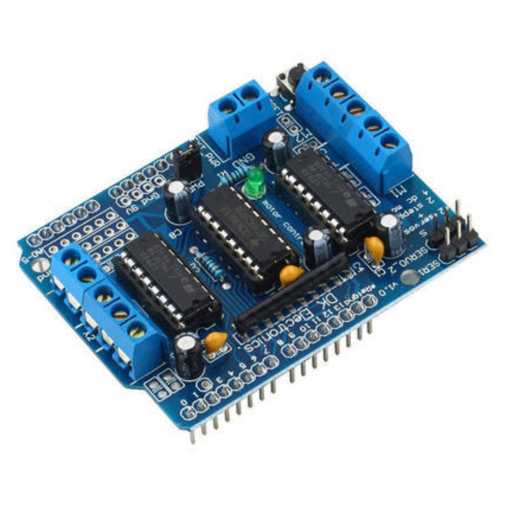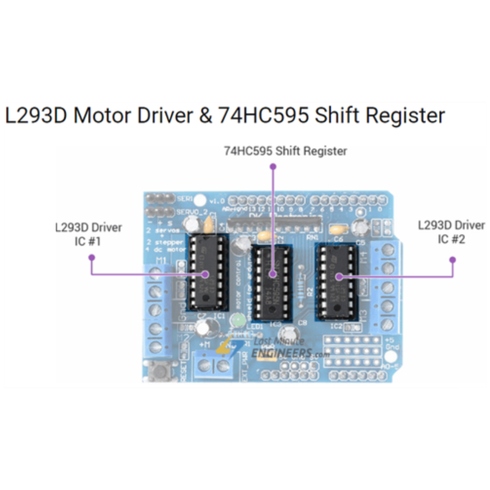 Üzerinde barındırdığı 2 adet L293D motor sürücü entegresi ve 74HC595 shift register sayesinde; 4 adet DC motoru birbirinden bağımsız sürebilir, hız ve yönlerini kontrol edebilirsiniz. Ayrıca DC motor yerine step motor veya servo motor kullanmak isteyenler için de mükemmel bir çoklu çözüm sunar.